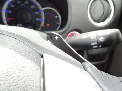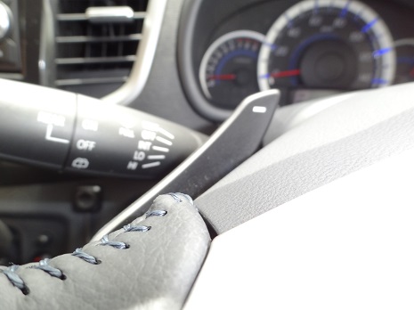 シフトレバーをMレンジへ入れれば、ドライブが一気にスポーティーに。7速マニュアルモードに切り替わり、ステアリングに装備されたパドルシフトで、シフトチェンジの爽快感を味わうことができる。また、エンジンブレーキを効かせたい場合には、Dレンジのまま、一時的にシフトチェンジが可能になる。